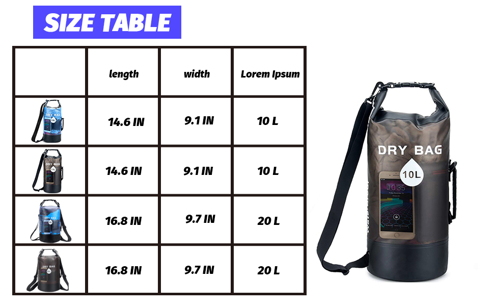 ✔ Adjustable Back Straps - We used adjustable buckles straps with firm side handle, which allows for comfortable carry and fits most body sizes, 10L comes with a single strap, two straps for 20L, suitable for different occasions and no ripping again even for heavy load,lightweight dry bag won't aggravate the burden of your arms or shoulder.