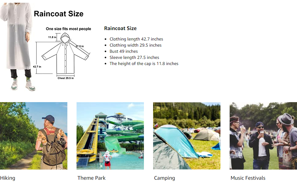✔ RAINCOAT SIZE: Clothing length 42.7 inches, clothing width 29.5 inches, bust 49 inches, sleeve length 27.5 inches, the height of the cap is 11.8 inches. One size fits most people. You can buy it directly without worrying about the size.