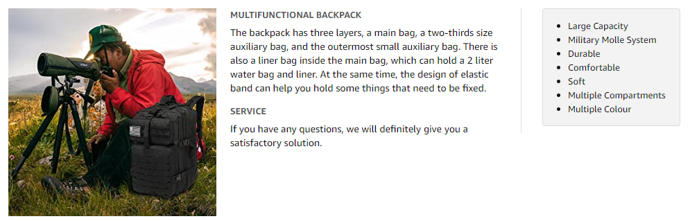 ✔ MILITARY MOLLE SYSTEM: The molle webbing system of the 3 day assault pack is designed to attach more tactical bags and other equipment. It is a top loader backpack with 6 rows of molle velcro areas. The front, sides and bottom as well as the shoulder straps are all equipped with molle to attach any equipment. The front features D-ring that can be used to hang other items as the bottom strap can be used to fix tents or sleeping mats or any other outdoor equipment you may want attaching.