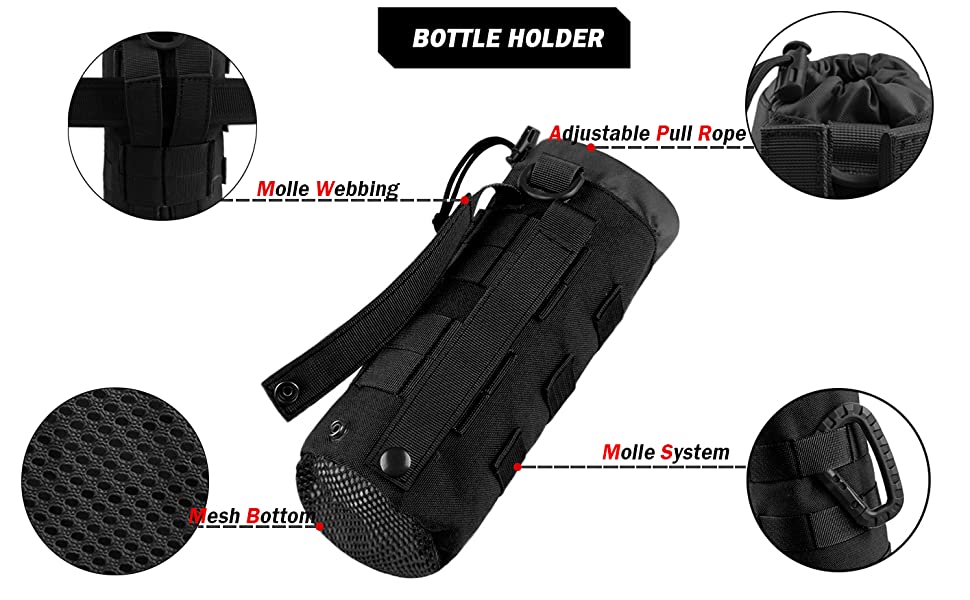 ✔ Mollo System: The EDC pouch design with two-way zippers allows you to quickly zip it shut from either both sides or access just one side of the molle pouch. The bottle holder has adjustable drawstring on top to firmly hold the bottle in place.