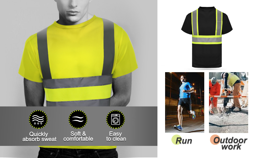 ✔ Materials: High visibility reflective safety T-shirt is unisex. Made of mesh fabric, 100% polyester fabric & reflective material, the reflective work short has features of breathable, lightweight and durable. T-shirt adopts quick drying technology, comfortable, hygroscopic and sweat releasing.
