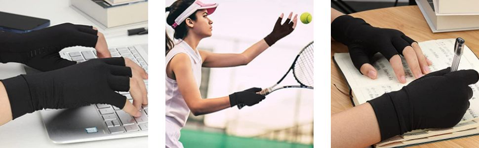 ✔ ERGONOMIC DESIGN: The open finger copper compression arthritis gloves are ergonomically designed to make your hands more flexible. Anti slip silica gel is attached to the palm, which increases the friction of the hand and can grip items more securely. Perfect for working on your computer, writing, cooking dinner, cleaning the house, and cycling.