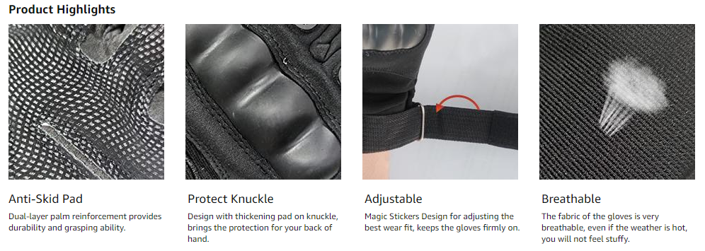 ✔ PROTECTION: The fingerless outdoor gloves provide excellent protection performance. The sturdy thickened knuckle cushion and palm protection pad not only strengthen the grip, also defend your hands from harm effectively.