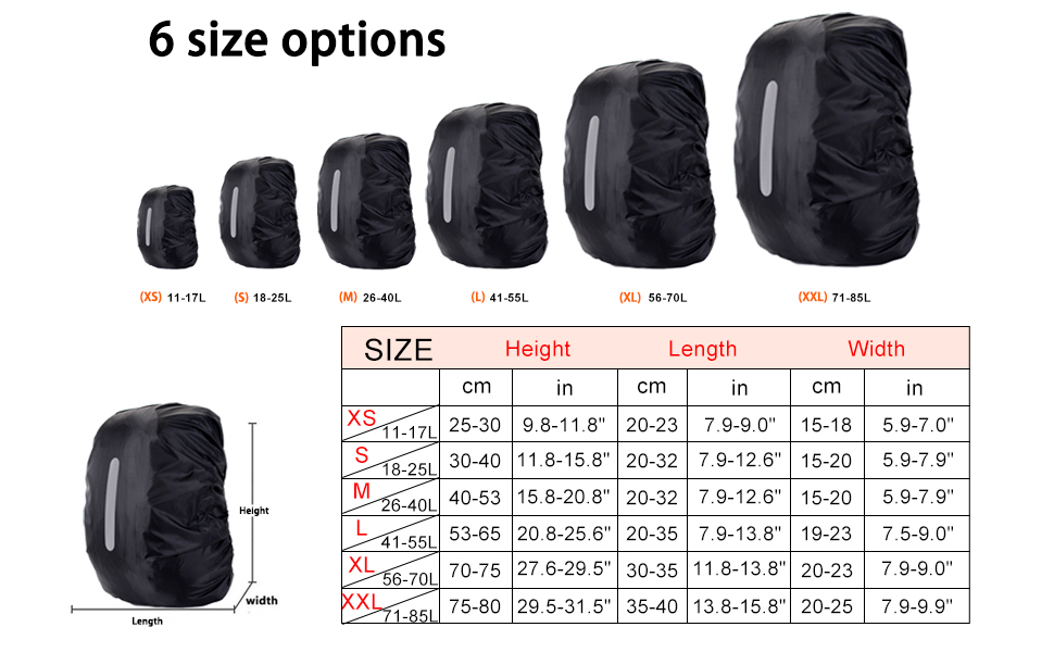 ✔ Multiple Sizes: The rain covers have six sizes and can available fit all types of backpacks from 10 to 85 L. Please refer to our size chart to choose the right size when purchasing.