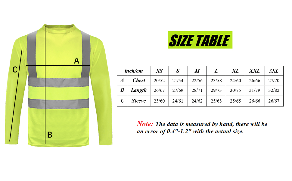 We have 6 sizes and 2 colors for short sleeve safety T-shirts. Check the SIZE TABLE carefully before ordering. Choose the fit size!