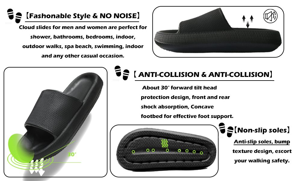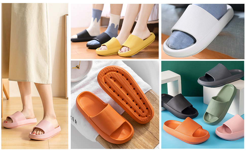✔ Premium Material: The cloud slides for men and women are made of high-quality EVA, which is environmentally friendly, anti-compression, noise-free, non-absorbent, and easy to clean.