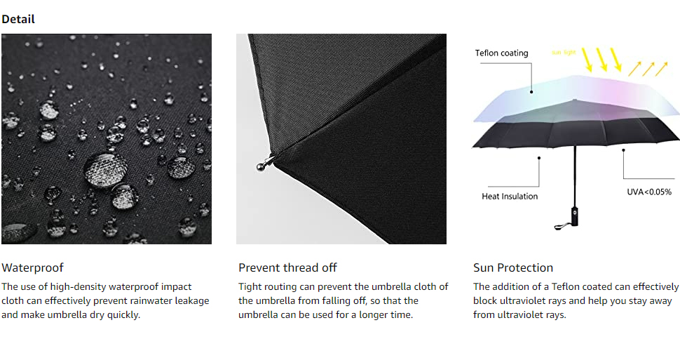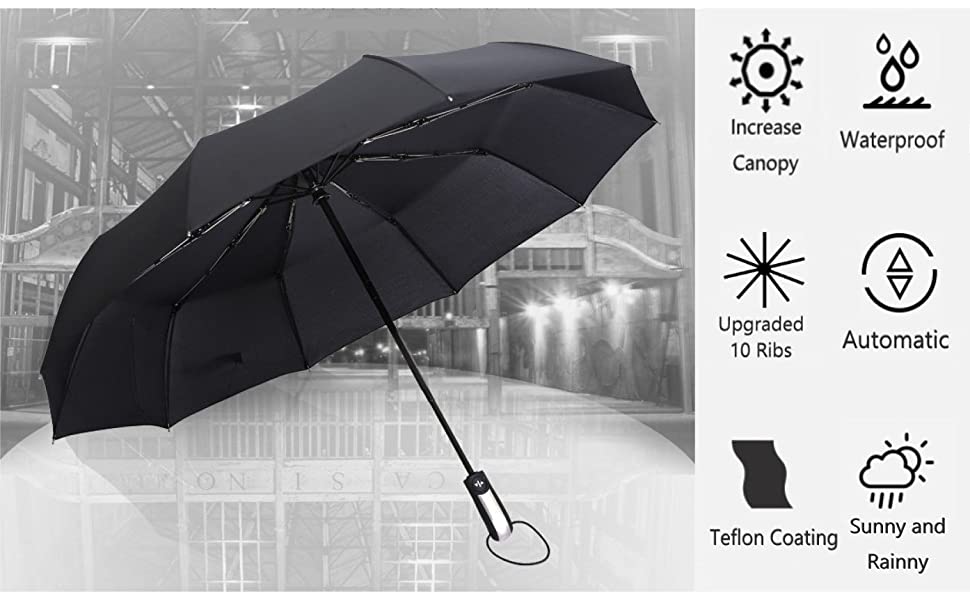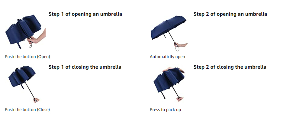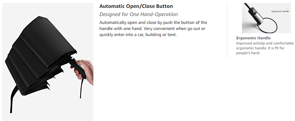 ✔ AUTO OPEN/CLOSE: You can press the button on the travel umbrella handle with one hand, and the travel umbrella will open or close within a second. This will free your hands and you no longer have to worry about opening and closing the umbrella.