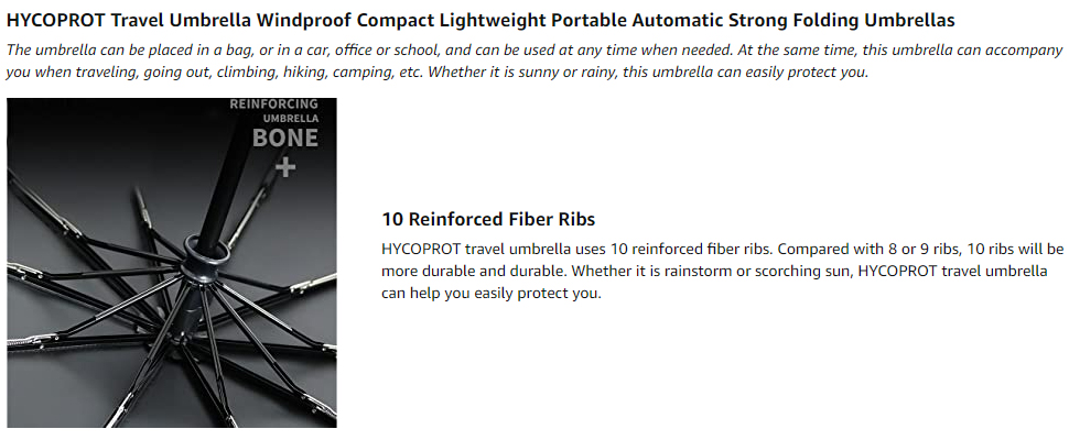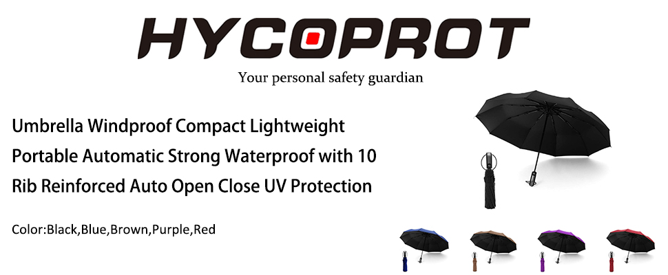 ✔ DURABLE & STRONG: HYCOPROT travel umbrella uses 10 reinforced fiber ribs. Compared with 8 or 9 ribs, 10 ribs will be more durable and durable. Whether it is a rainstorm or scorching sun, HYCOPROT travel umbrella can help you easily protect yourself.
